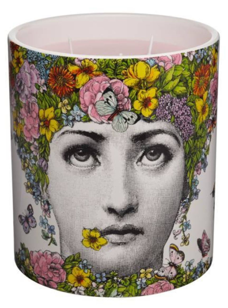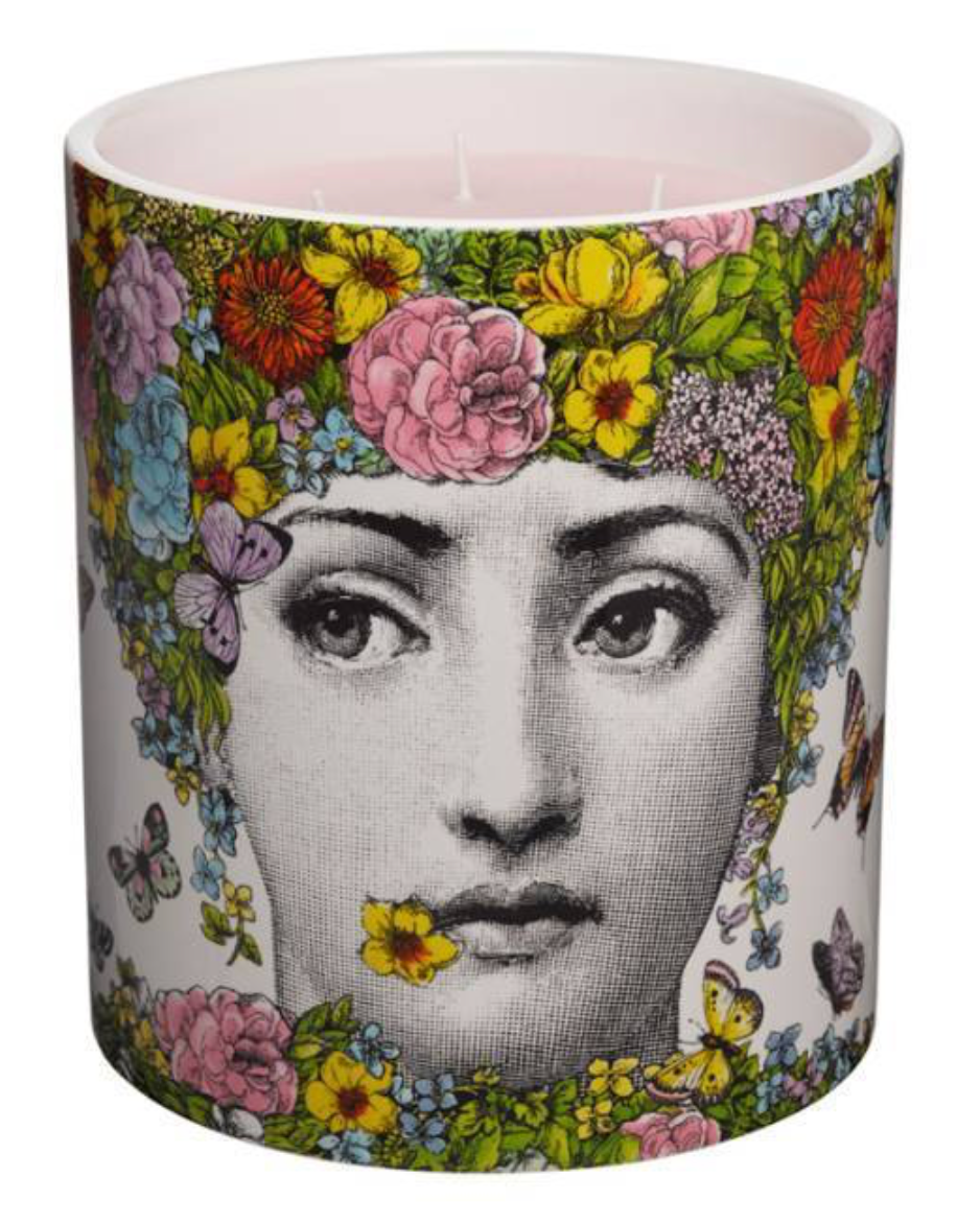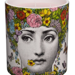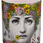 Fornasetti's Flora Large Candle. 7" height 67 oz.  240 hour burn time The iconic portrait of Lina Cavalieri is pictured with an elaborate ‘hair-do’ full of colorful flowers which transforms her into the mytho-logical goddess ‘Flora’. Contains the scent of  ‘Flora Di Fornasetti’.