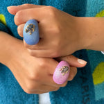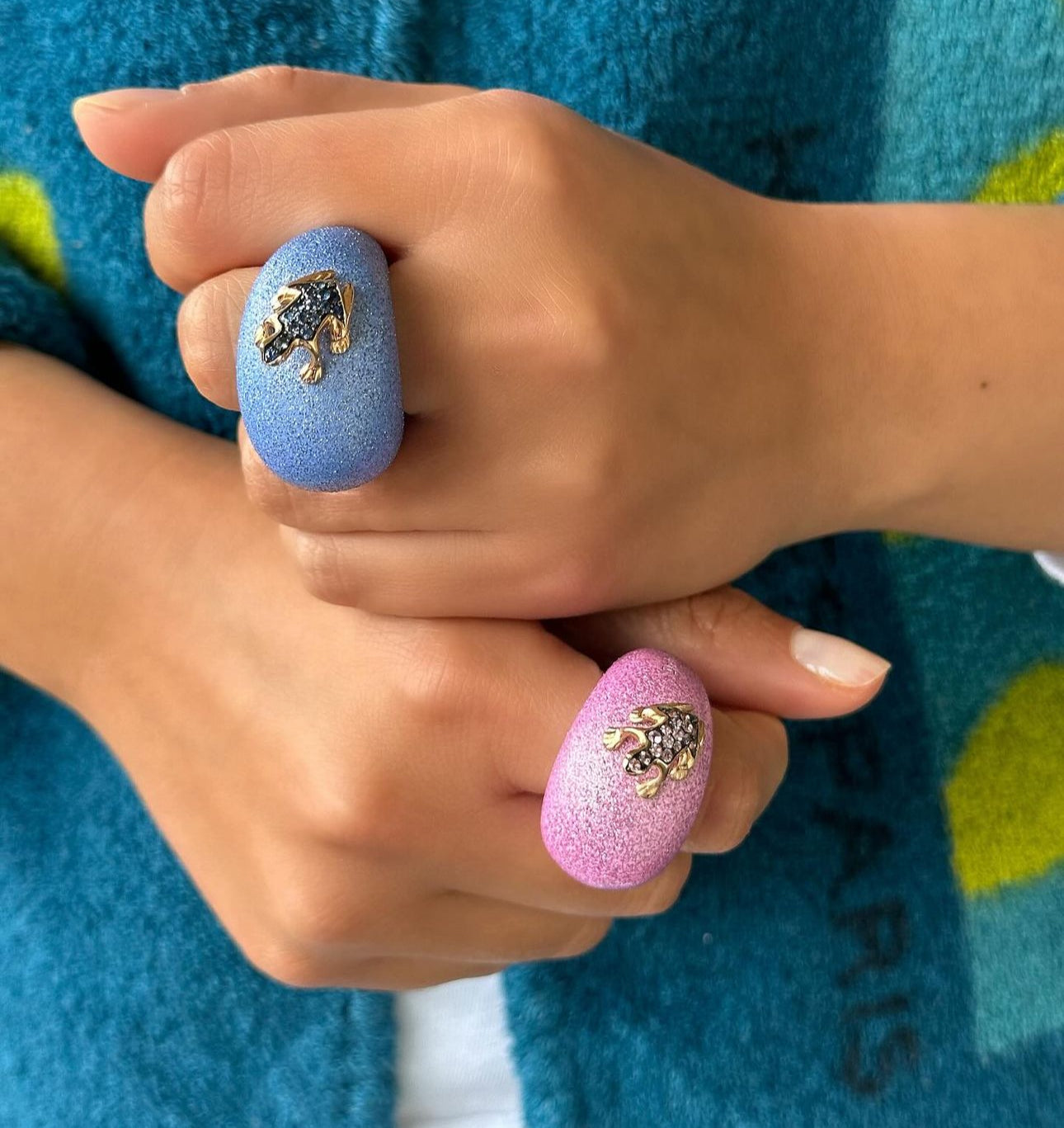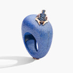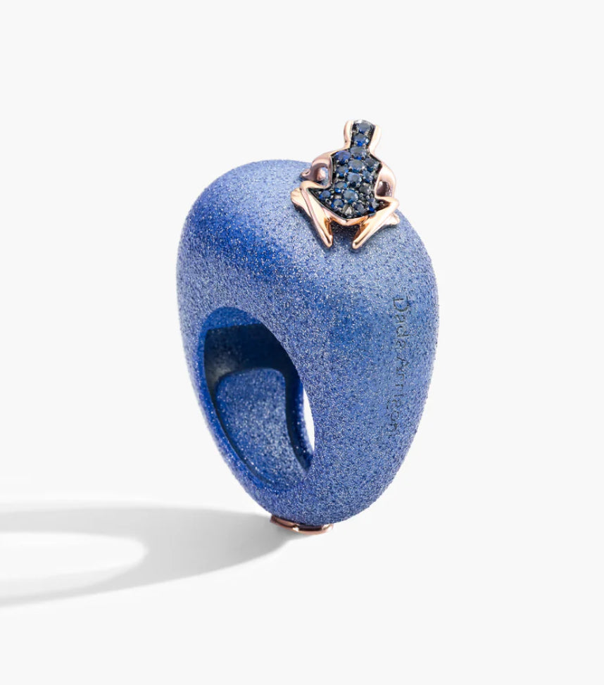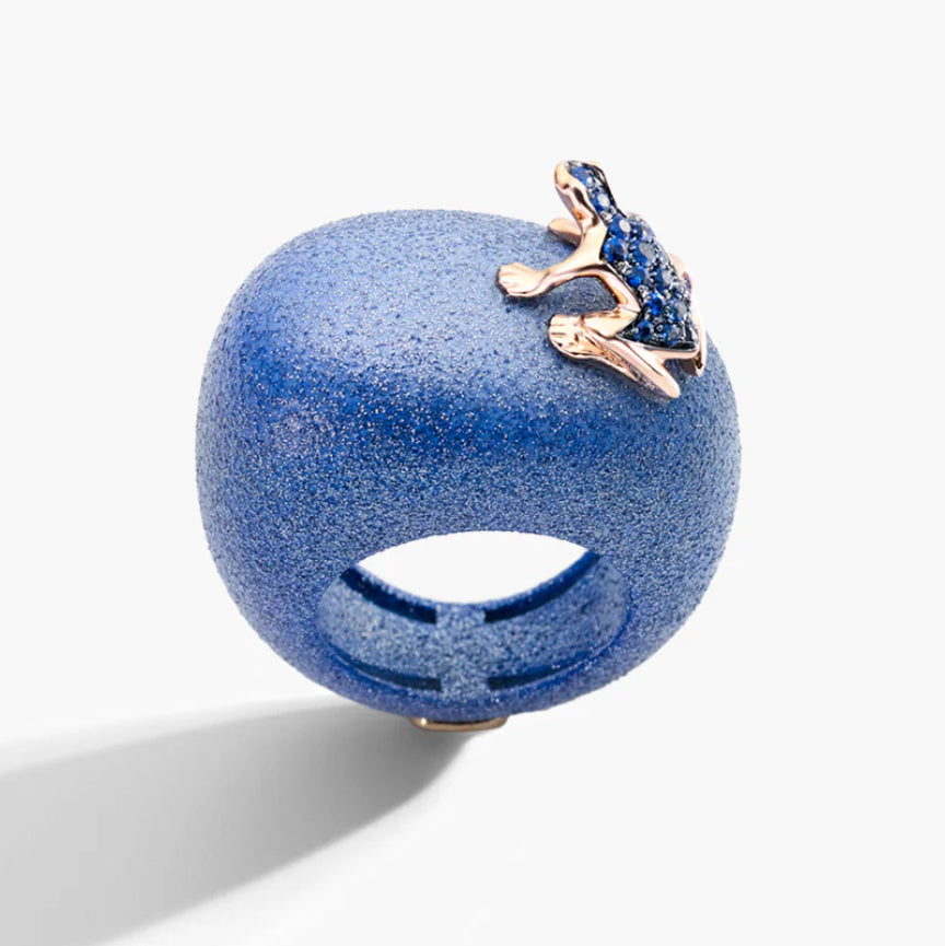 The sculpture ring from the iconic Happy Frog collection has a base in 925 Silver, the color of which is obtained through a manual painting treatment that has a material finish. The frog is in 18k Rose Gold and blue Sapphires. A combination that gives the jewel a contemporary design, the result of the union between creative impulse and Italian goldsmith craftsmanship. A porte-bonheur, ideal for occasions when you want to wish the best to the people closest to you. Internally a spring allows you to reduce the size by 2 sizes.